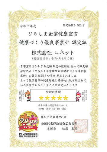 2022年 広島本社: ひろしま企業健康宣言健康づくり優良事業所に認定