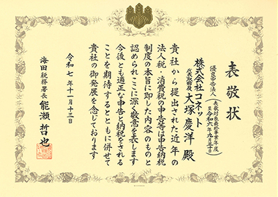 2025年11月13日、弊社は長年に渡る適正な申告と納税の実績、良好な経理処理が評価され海田税務署より「優良申告法人」として表敬状を拝受しました。
